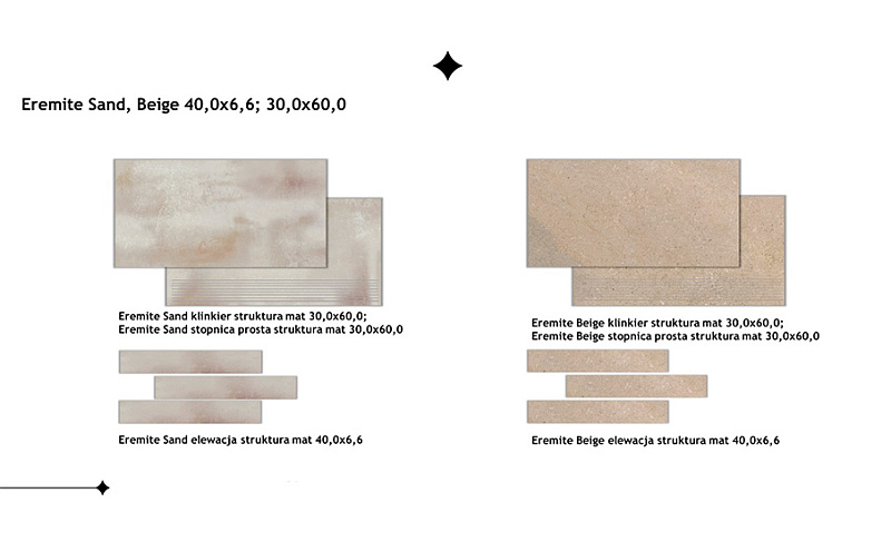 Она доступна в четырех различных цветах: мягкий бежевый, приглушенный и теплый серый, трендовый серо-коричневый и уютный кремовый оттенок. Каждый из цветов имеет дополнительную интересную структуру, дополненную потертостями и ямочками, которые максимально приближают внешний вид плитки к натуральному сырью. Использование такой комбинации структур и цветов на двух разных форматах (современный, вытянутый кирпич 6,6х40 см и классический прямоугольник 30х60 см) позволяет создавать современные обустройства фасадов, террас, заборов и внутренних стен, оставаясь в привычном, классическом климате. Клинкер Eremite также идеально сочетается с террасной плиткой 2.0, предлагая еще больше возможностей для создания целых экстерьерных и интерьерных зон вашего дома.
