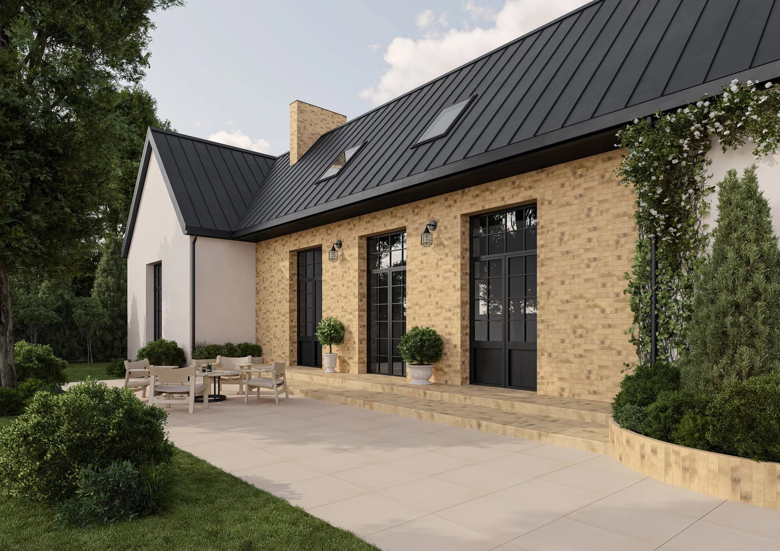 Она доступна в четырех различных цветах: мягкий бежевый, приглушенный и теплый серый, трендовый серо-коричневый и уютный кремовый оттенок. Каждый из цветов имеет дополнительную интересную структуру, дополненную потертостями и ямочками, которые максимально приближают внешний вид плитки к натуральному сырью. Использование такой комбинации структур и цветов на двух разных форматах (современный, вытянутый кирпич 6,6х40 см и классический прямоугольник 30х60 см) позволяет создавать современные обустройства фасадов, террас, заборов и внутренних стен, оставаясь в привычном, классическом климате. Клинкер Eremite также идеально сочетается с террасной плиткой 2.0, предлагая еще больше возможностей для создания целых экстерьерных и интерьерных зон вашего дома.