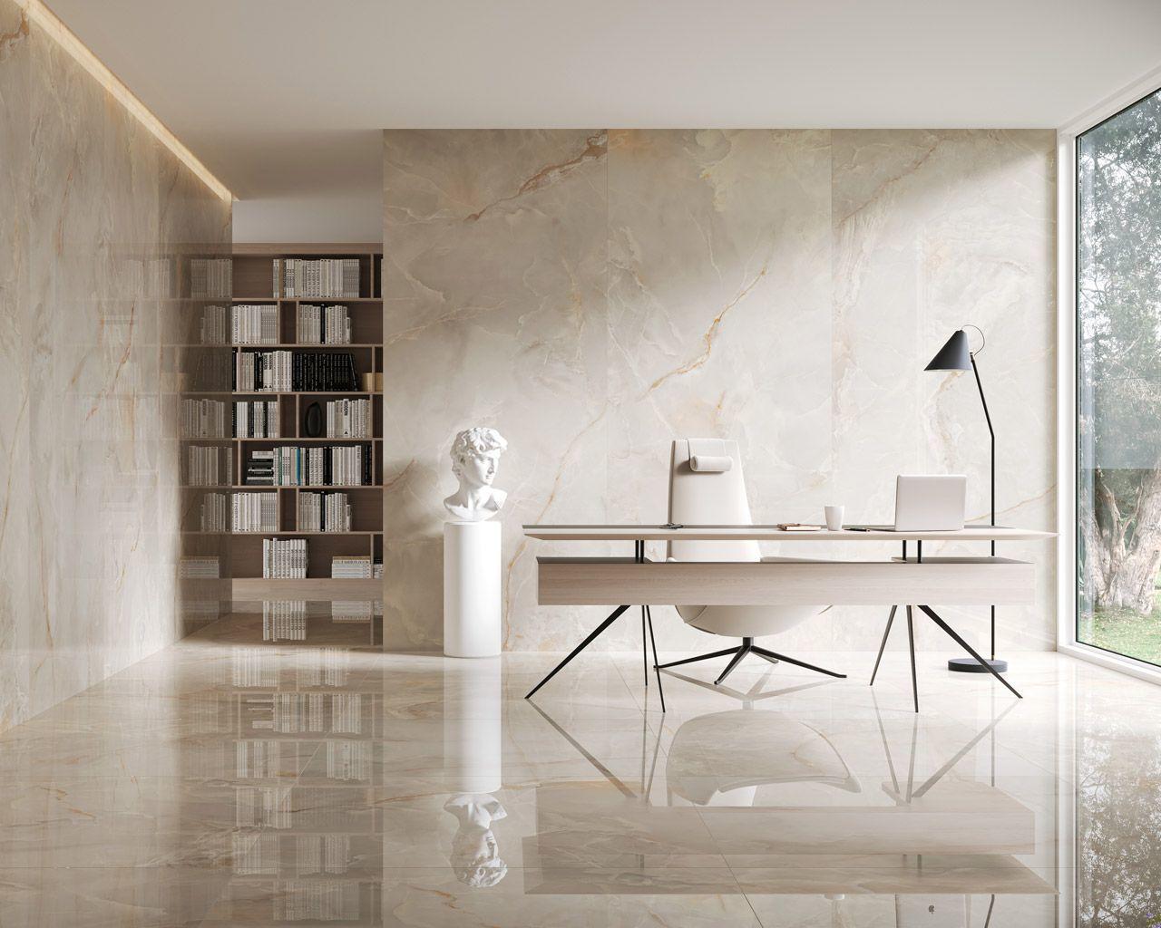 INVISIBLE - это коллекция напольной и настенной плитки, вдохновленная камнем. Крупноформатная плитка из набора Monumental в светлом ониксовом цвете для ванных комнат, кухонь и гостиных, террас, вестибюлей, фасадов, а также инвестиционной недвижимости (например, рецепции в отелях). Плиты размером 60x120 см, 120x120 см и 120x280 см.